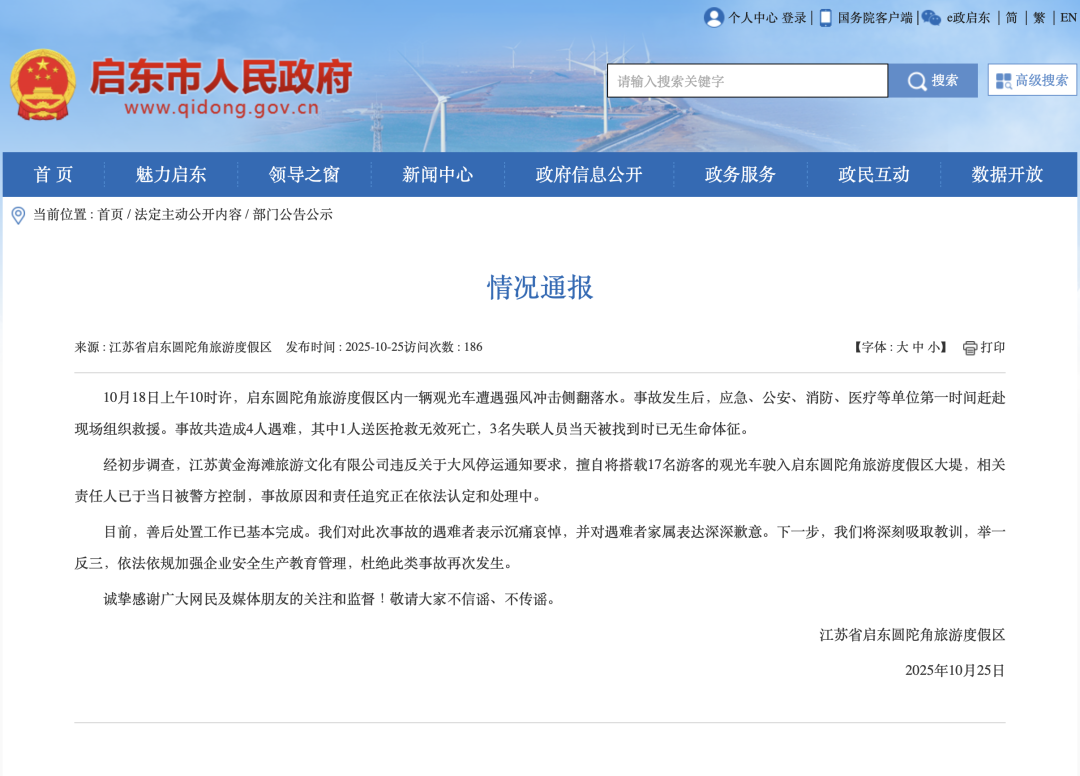 10月18日上午10时许,启东圆陀角旅游度假区内一辆观光车遭遇强风冲击侧翻落水。事故发生后,应急、公安、消防、医疗等单位赶赴现场组织救援。事故共造成4人遇难,其中1人送医抢救无效死亡,3名失联人员当天被找到时已无生命体征。