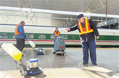 接下来的几年,随着列车从“绿皮车”升级到高铁动车,车站发展为现代化交通枢纽,客运服务也有了更精细、更高效、更专业的分工。客运值班员专注旅客服务组织,杨进荣和同事们则精准做好车站保洁。车站还拥有了专业保洁合作团队,保洁设备也逐代升级,手推式洗地机、打磨机、高压水枪取代了老式的扫帚、墩布,清洁效率翻了几番。